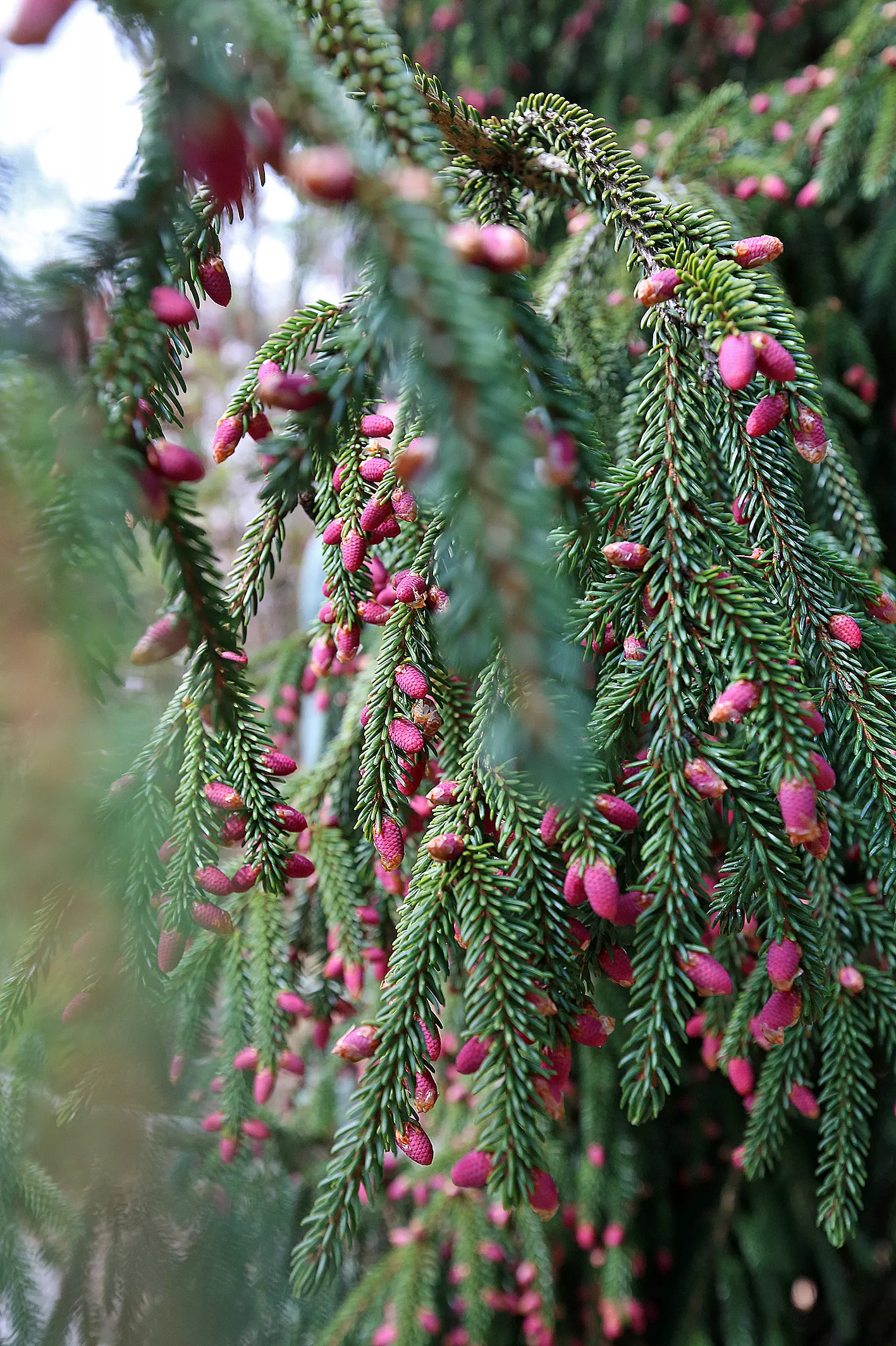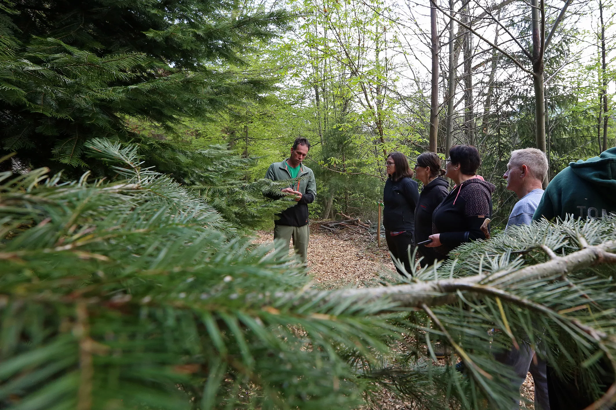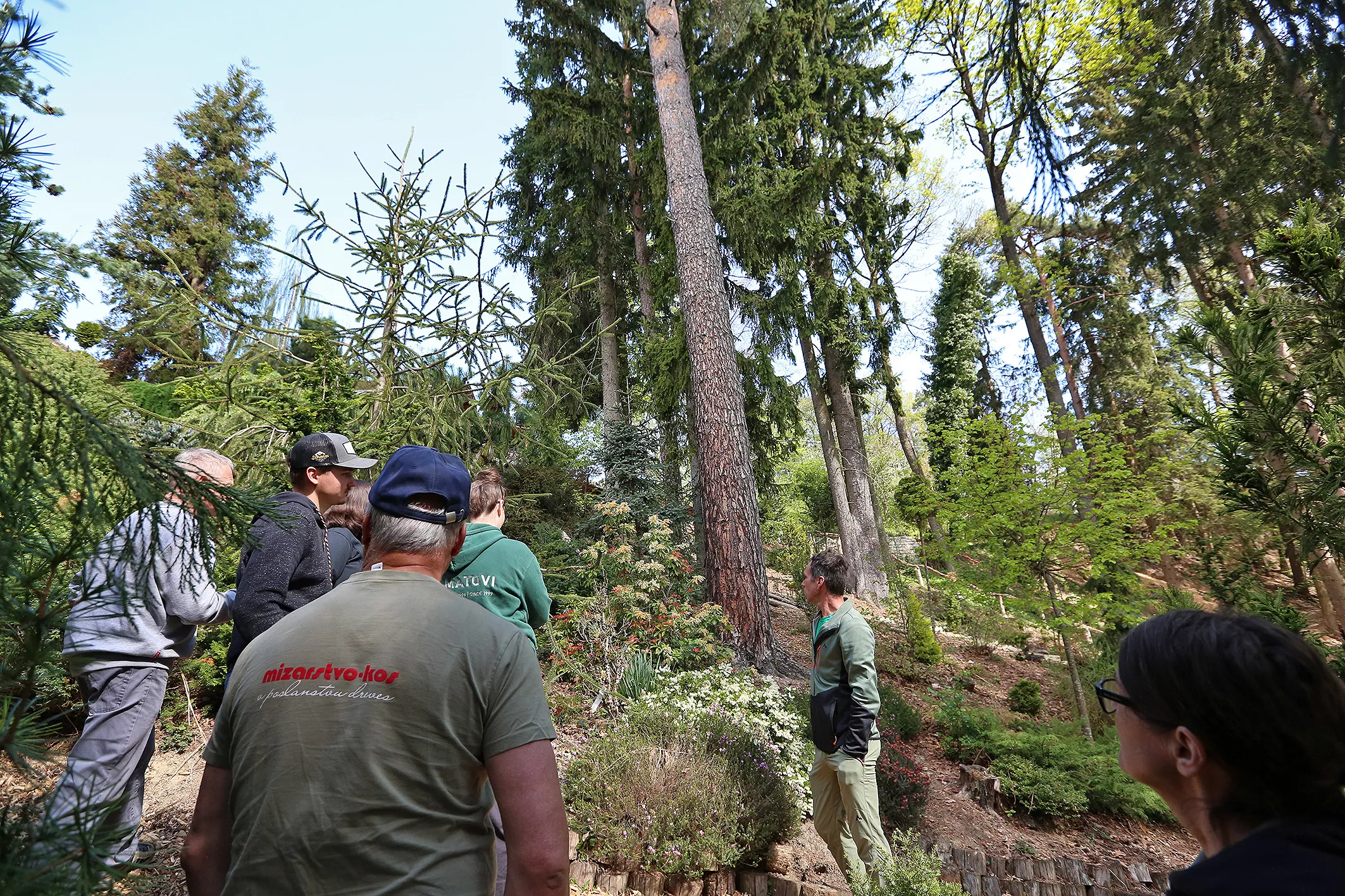 Miha je izčrpno predstavil bore, ki jih strokovno delimo na 1-, 2-, 3- in 5-igličaste vrste, ter nam pokazal stebričasti črni bor. Jelke so bile zastopane z dišečo, špansko, stebričasto nordijsko, korejsko (ki se ponaša s čudovito kompaktno, gosto strukturo rasti in vijolično-modrimi storži) ter jelko, primerno za vzgojo novoletnih drevesc. Med smrekami nismo mogli spregledati kavkaške z rdečimi cvetovi, kačaste, omorike-Pančićeve, povešave, stebričaste polsrebrne ter avtohtone.