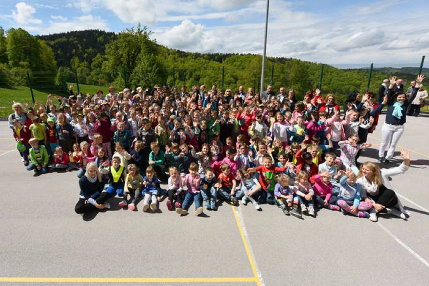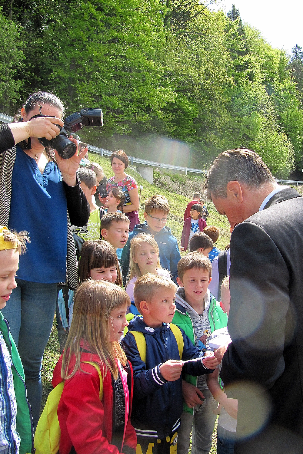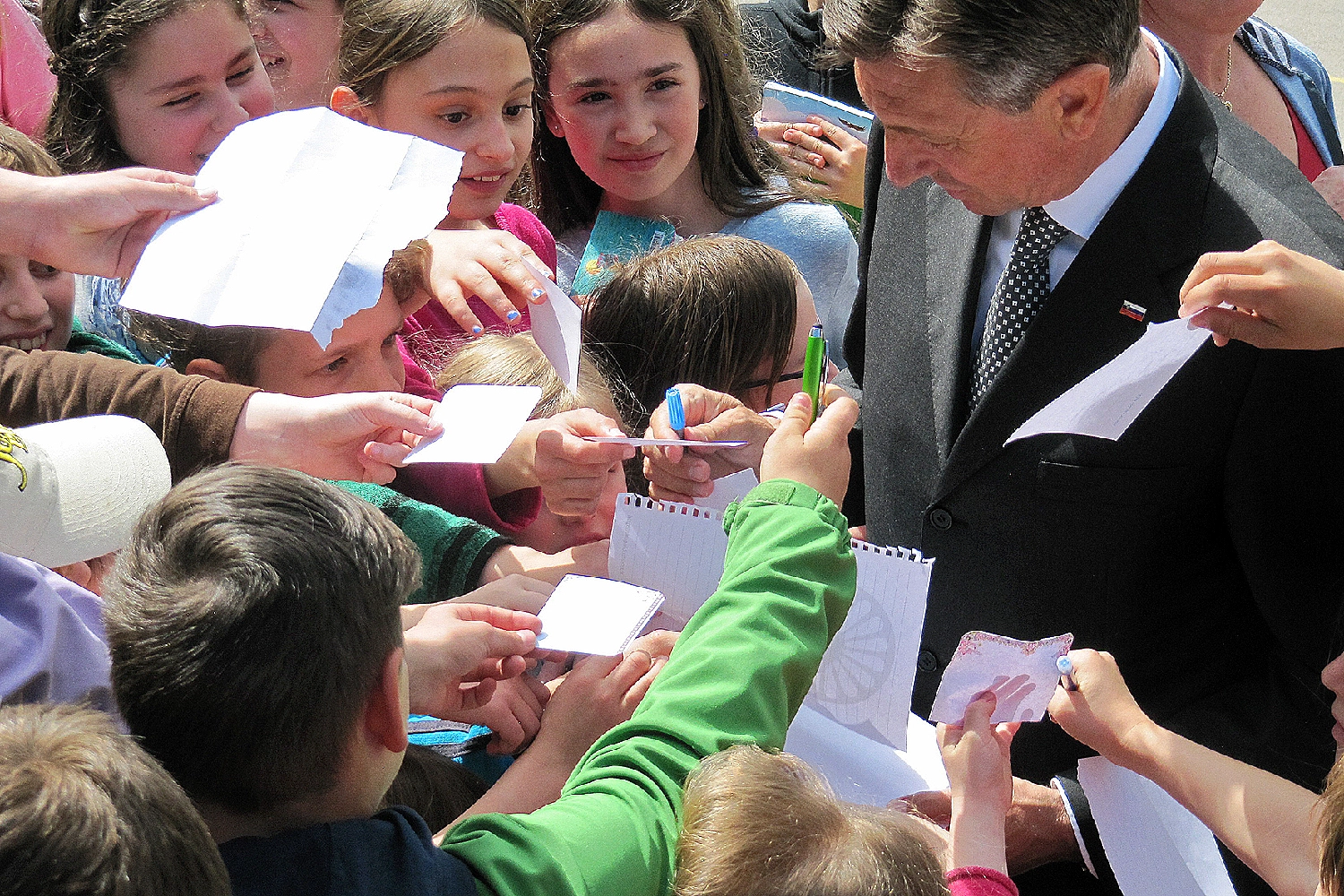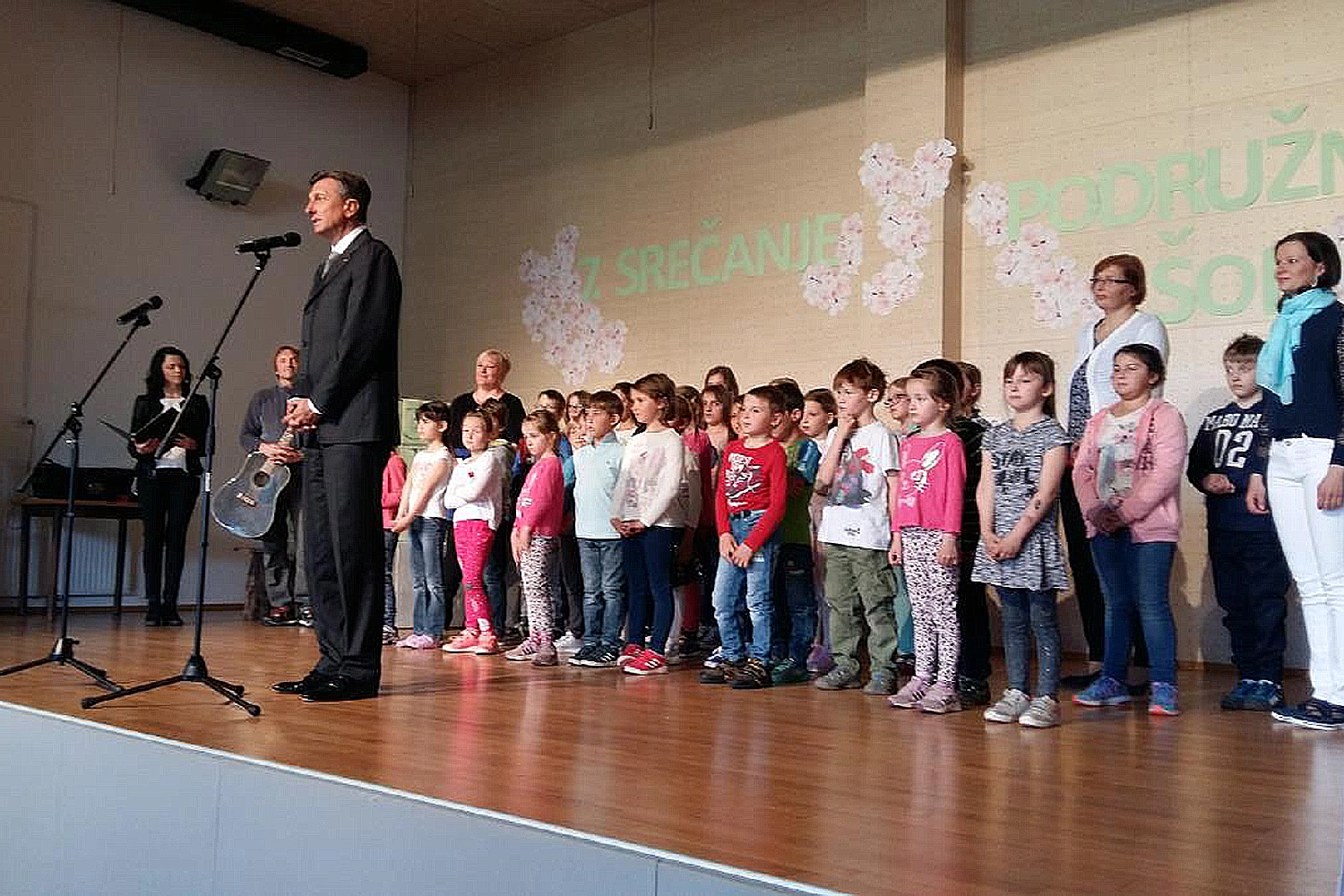 Dočakali smo našega predsednika Boruta Pahorja, ki se je odzval na povabilo vodje šole, Katarine Juvan. Kot je povedal v svojem govoru, je navdušen nad našim lepim krajem. Poudaril je pomembnost delovanja podružničnih šol in videli smo, da je užival v kratkem kulturnem programu, ki so ga pripravili naši šolarji in otroci iz vrtca. Seveda smo skupaj z njim naredili eno skupinsko fotografijo, ki bo lep spomin na nepozaben dogodek. Vendar se naše srečanje s predsednikom ni končalo s fotografiranjem, ampak z delom, tako kot je v navadi v našem kraju ter v predsednikovem kabinetu. Skupaj z učenci je zasadil lipo, osmo drevo v našem drevoredu. Drevored, iz katerega razgled sega vse do Triglava, še enega simbola slovenskega naroda. Srečanje podružničnih šol na Polšniku.