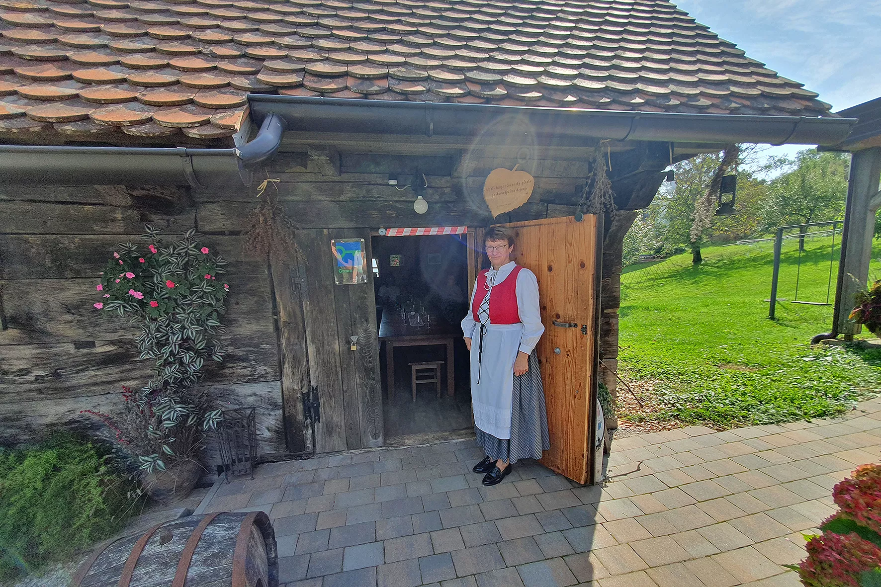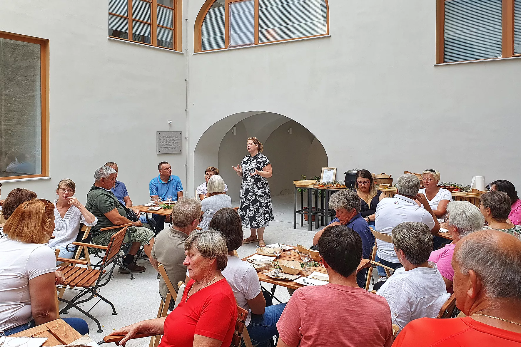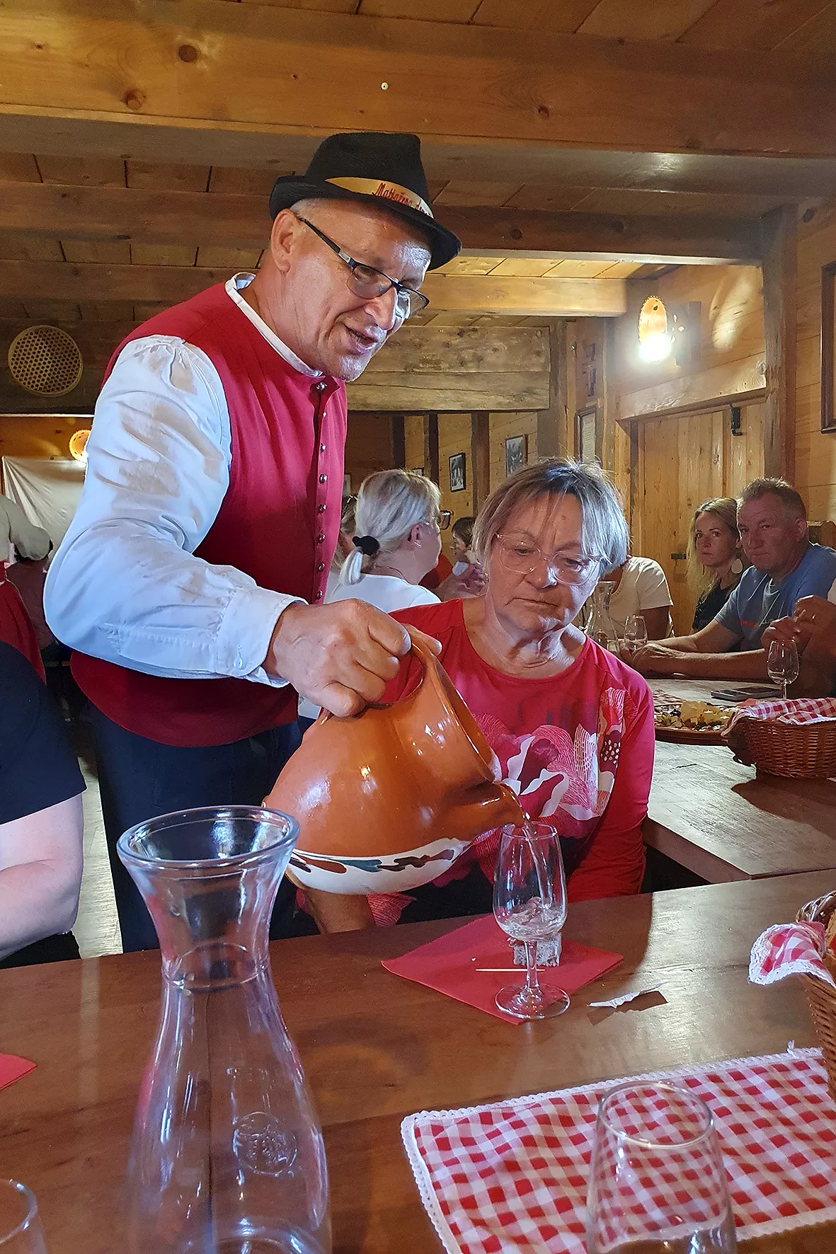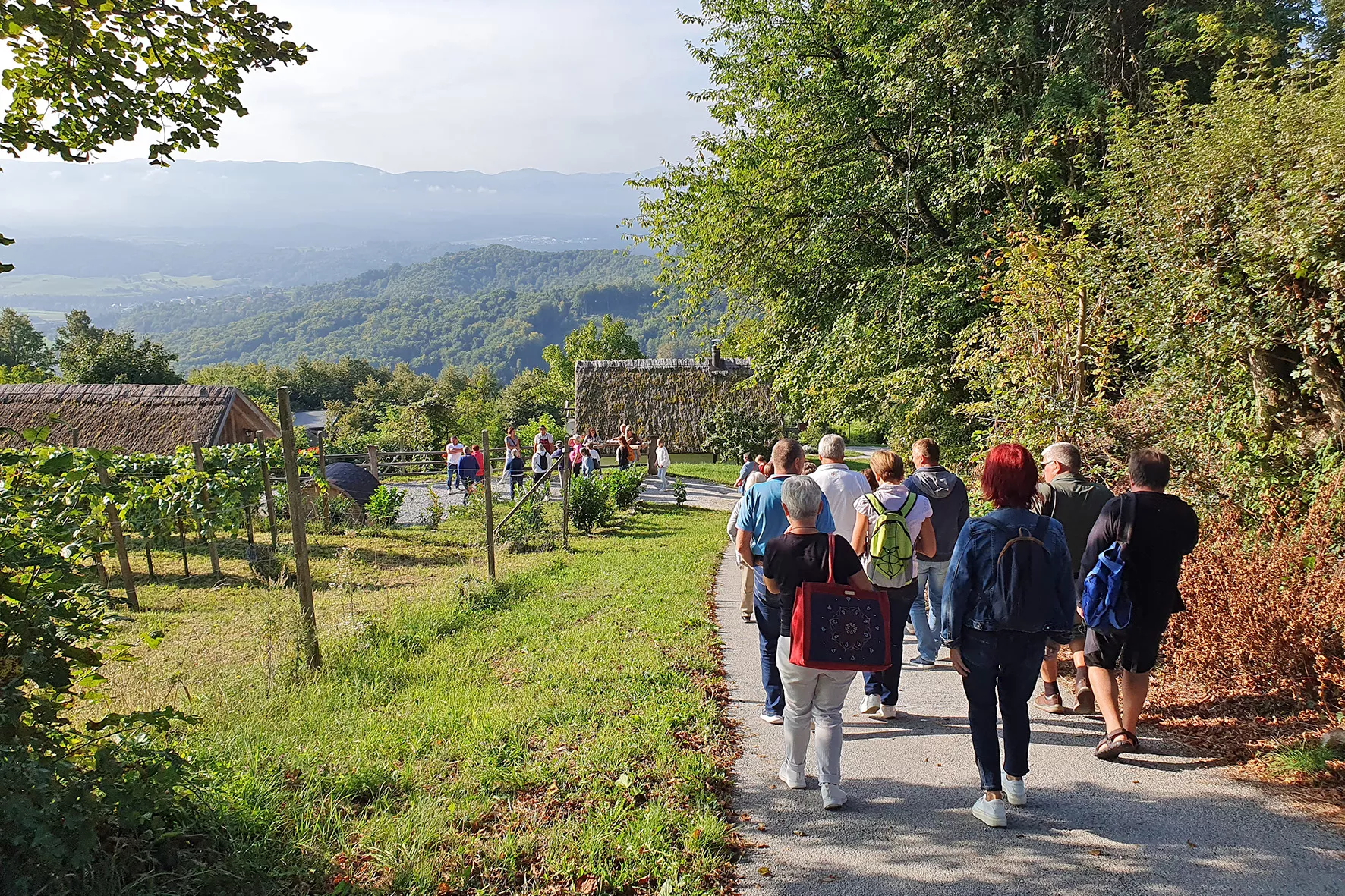 Prvi postanek je bil v vinski gorici Grčevje, kjer smo spoznali primer uspešne oživitve kulturne dediščine skozi projekt Turizem v zidanicah. Na Matjaževi domačiji smo si ogledali značilne dolenjske zidanice, obnovljene iz starih zapuščenih objektov, ki danes nudijo avtentična turistična doživetja pod blagovno znamko Zidanice Škatlar. Ob domačem narezku smo okušali inovativne produkte, kot sta »Cviček to go« ter raziskovali programe za timsko povezovanje. Spoznali smo tudi Cvičkovo princeso Ano Pavlin.